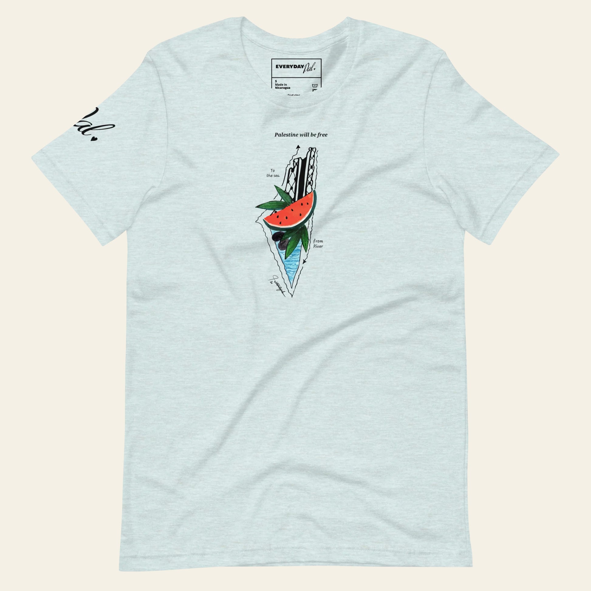 Created in collaboration with Palestinian artist Nada Rajab, working from Gaza under unimaginable circumstances, this design is a testament to resilience and creativity. Commissioned exclusively for EverydayPal, the piece carries her voice and vision across borders. The shirt itself is soft, lightweight, and perfectly balanced with just the right amount of stretch, made to feel as powerful as it looks, and flattering on everyone.