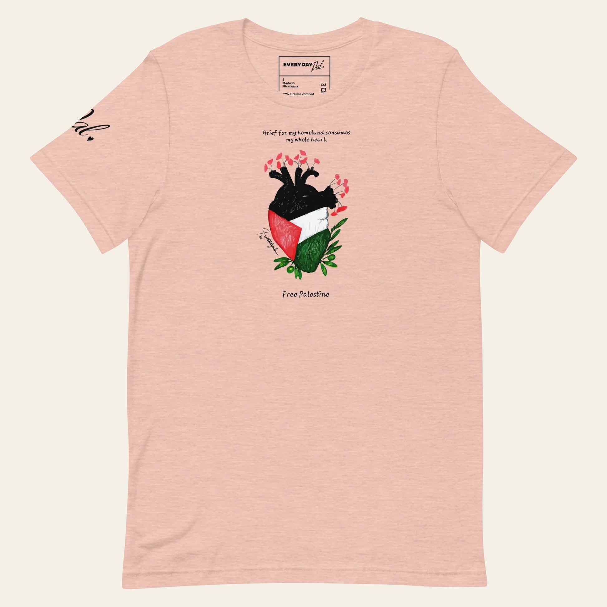 Created in collaboration with Palestinian artist Nada Rajab, working from Gaza under unimaginable circumstances, this design is a testament to resilience and creativity. Commissioned exclusively for EverydayPal, the piece carries her voice and vision across borders. The shirt itself is soft, lightweight, and perfectly balanced with just the right amount of stretch, made to feel as powerful as it looks, and flattering on everyone.